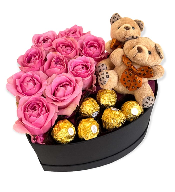 Ürün İçeriği : 10 adet Pembe gül 2 adet ayıcık 6 adet Rocher Çikolata